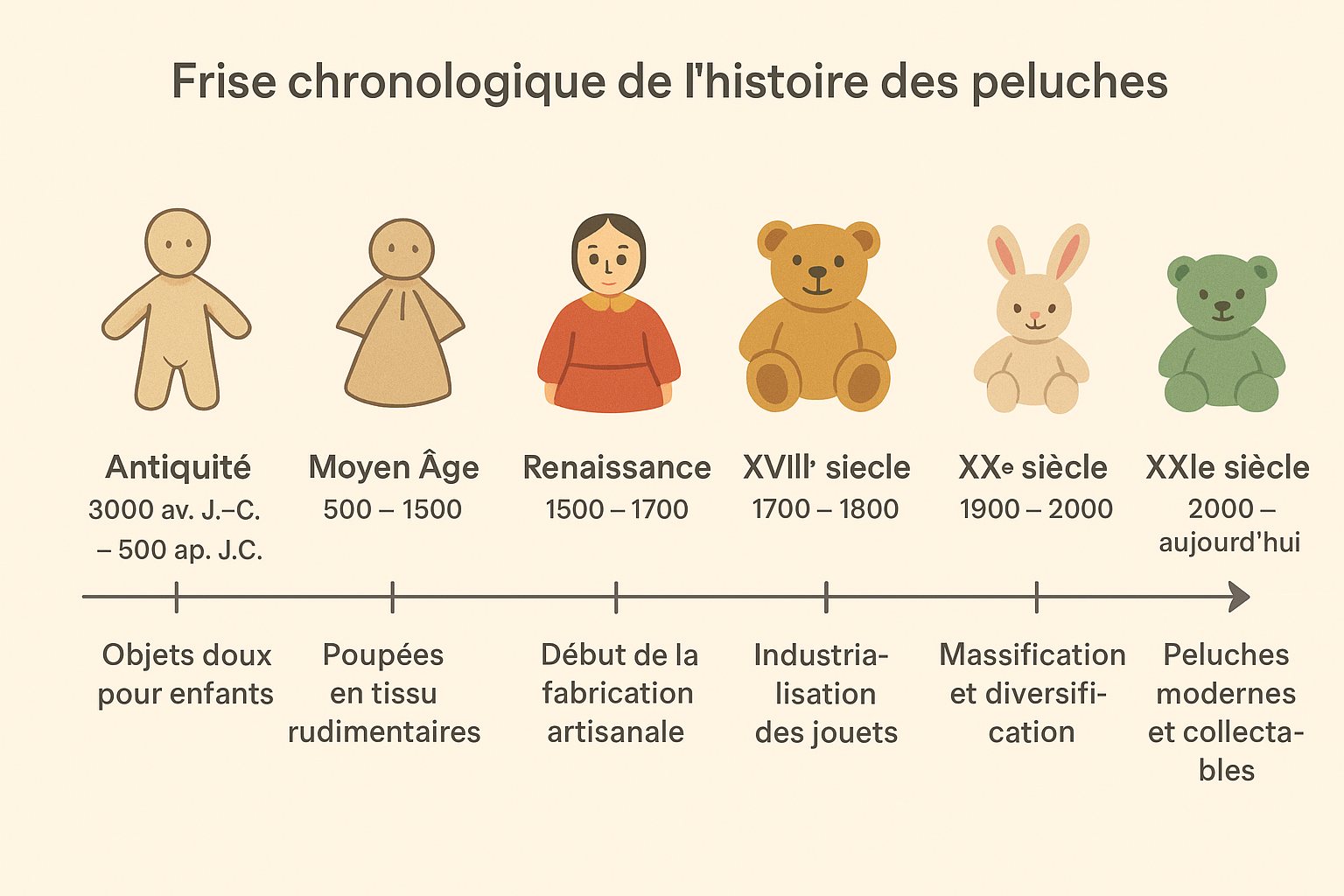 Au Moyen Âge, les jouets étaient rares et faits main, souvent par les familles. Les peluches au sens moderne n’existaient pas, mais des poupées en chiffon et des animaux en tissu commençaient à apparaître. Ces objets étaient précieux et transmis de génération en génération.